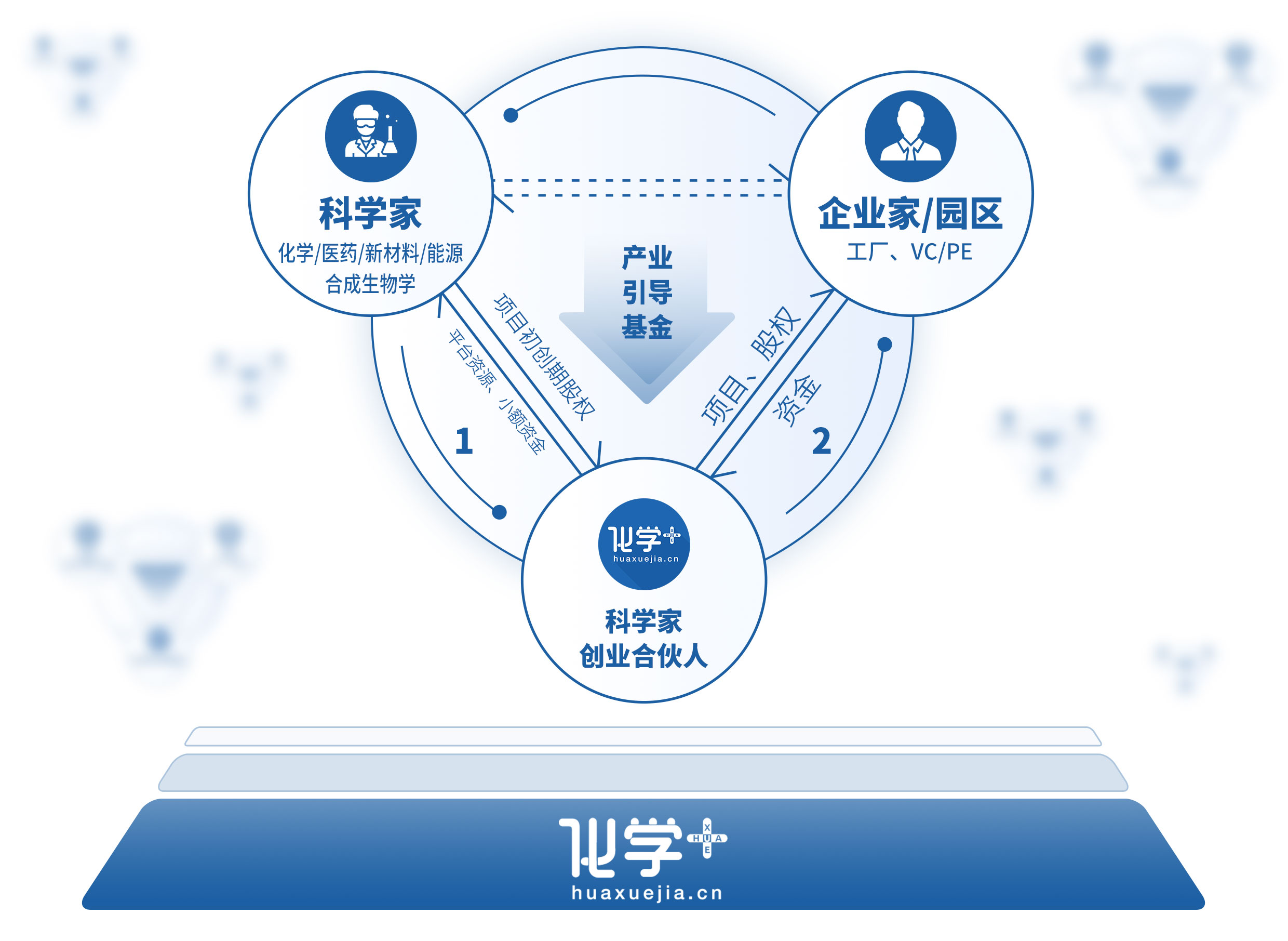 作為科學家創業合伙人這一角色,在科學家的橫向研究、創業項目、創業公司初始階段,化學加可以起到關鍵的角色互補作用,為項目、為科學家提供包括市場調研、企業需求對接、融資對接、園區入駐、品牌營銷(IP打造)、人才推薦等服務。