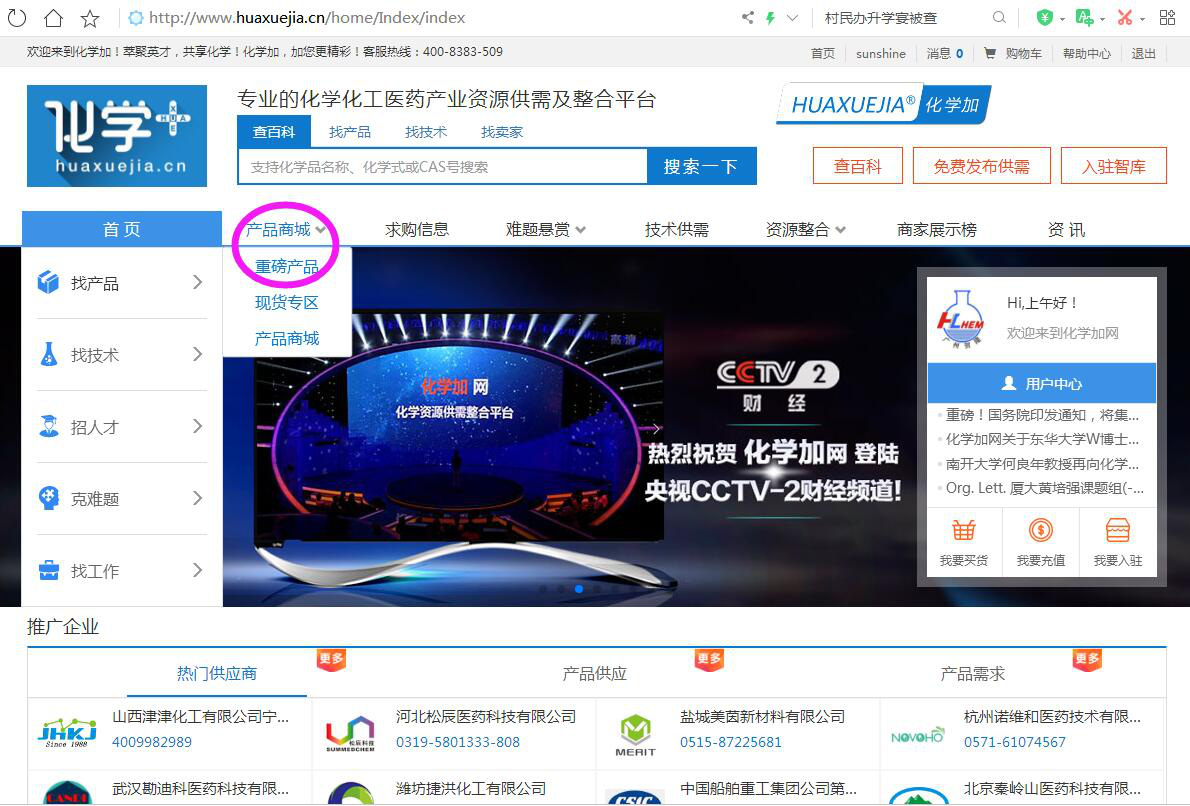 步驟三:設定好拳頭產品之后,返回化學加首頁。將鼠標移動到“產品商城”上,會顯示下拉菜單,點擊“拳頭產品”進入。