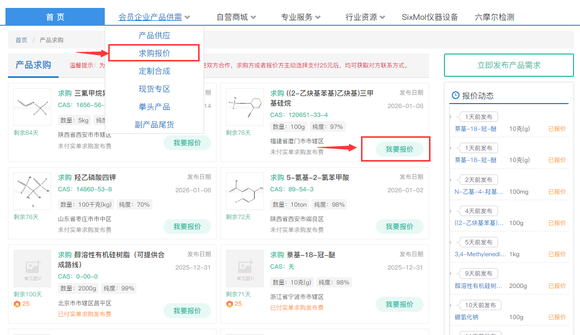 步驟一:登錄化學加網之后,在首頁點擊“會員企業產品供需”按鈕。下拉列表中,點擊“求購報價”。在列表頁中,點擊你需要報價的項目按鈕