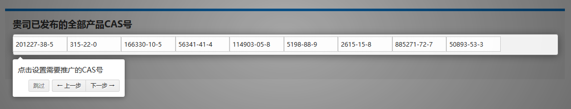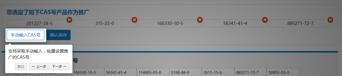 步驟四:這里是您已發布的全部產品的CAS號,點擊設置需要來推廣的CAS號;您也可以采取手動輸入,批量設置推廣的CAS號。